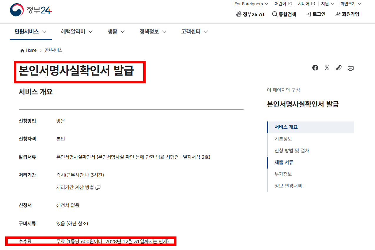 본인서명사실확인서는 원래 1통당 600원의 수수료가 부과되지만, 현재는 2028년 12월 31일까지 한시적으로 전액 면제되어 무료로 발급이 가능합니다.