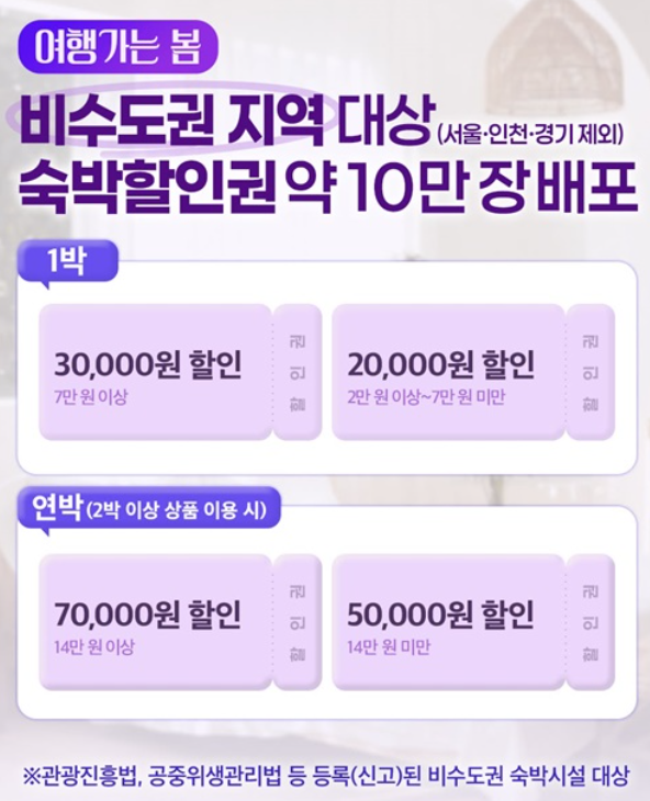 비수도권 관광 활성화를 위해 약 10만 장의 할인권이 선착순으로 배포되며, 1인당 1매씩 발급받을 수 있습니다.