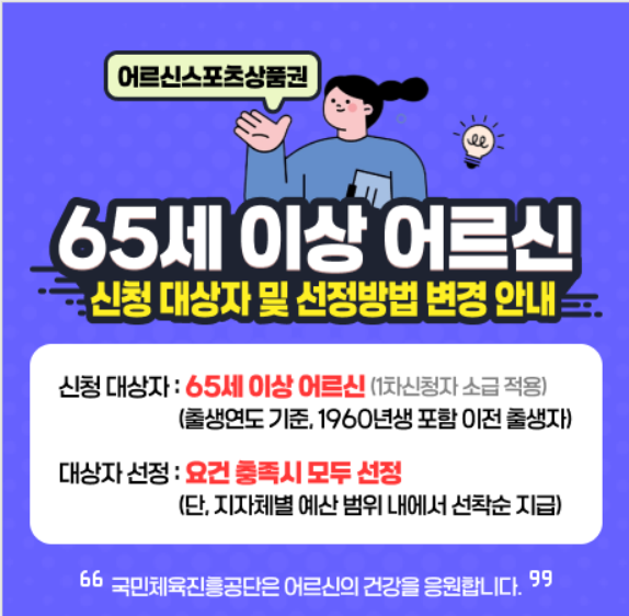 즉, 기초연금을 수급하는 어르신이라면 누구나 신청할 수 있고 스포츠 관련 시설에서 현금처럼 활용할 수 있는 혜택입니다.