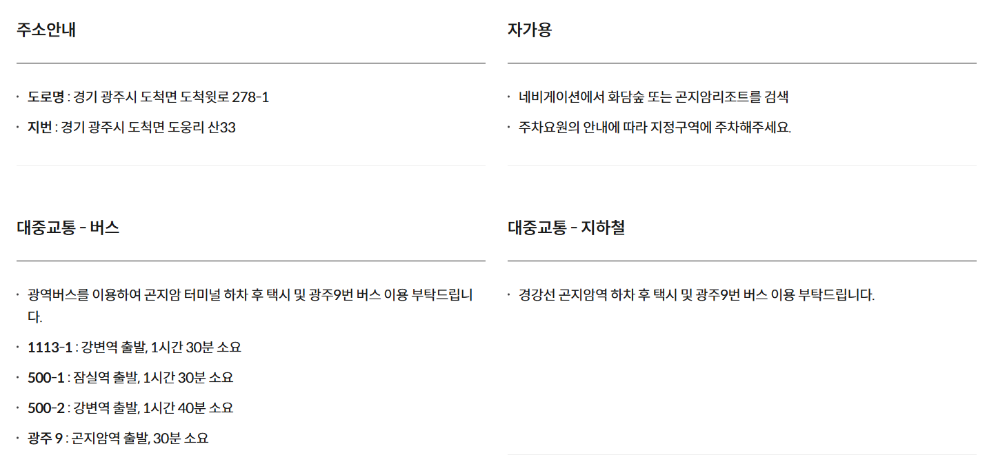 화담숲은 곤지암 리조트와 인접해 있는 서울 근교 인기 여행지입니다. 성수기나 주말에는 교통 혼잡이 예장되므로 미리 위치 확인해서 출발 시간 및 주차장 등 사전 계획 하시는 걸 추천드립니다.