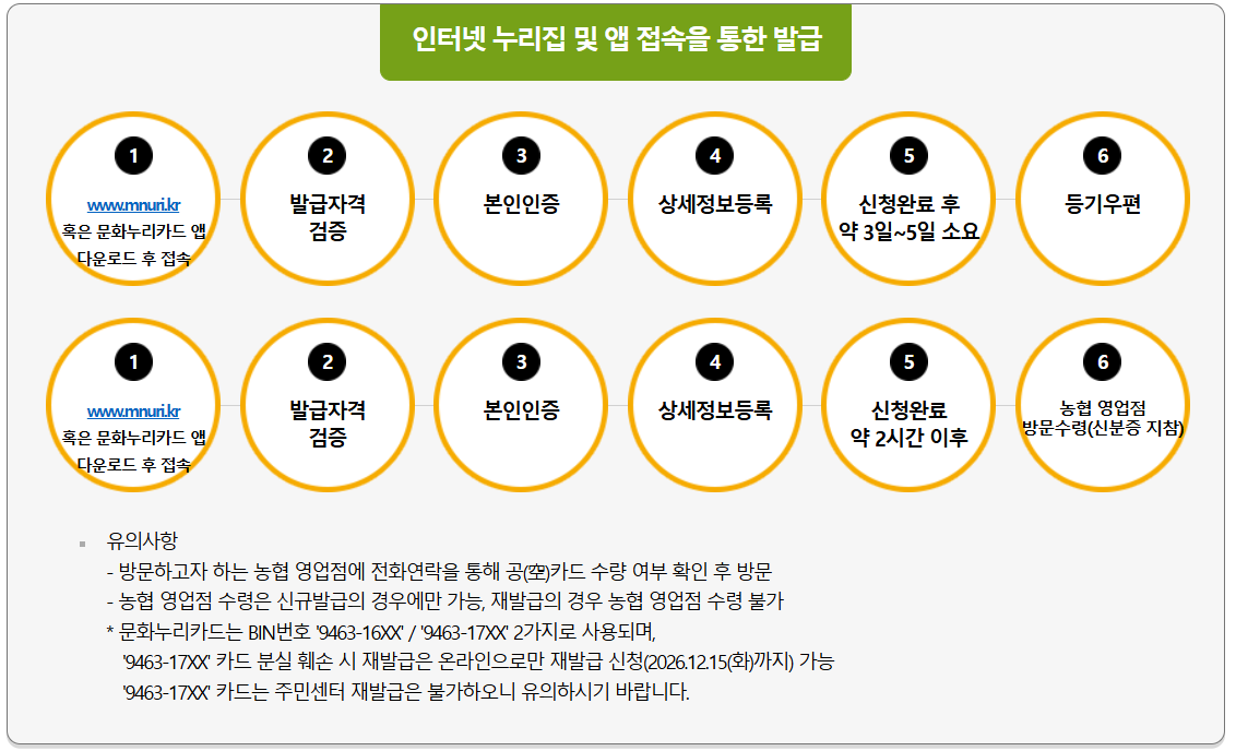 문화누리카드 홈페이지 또는 모바일 앱에서 신청할 수 있습니다.