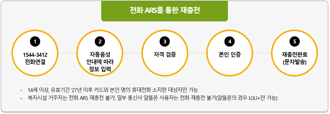 기존 카드 사용자는 전화로 재충전 신청도 가능합니다. (1544-3412)
